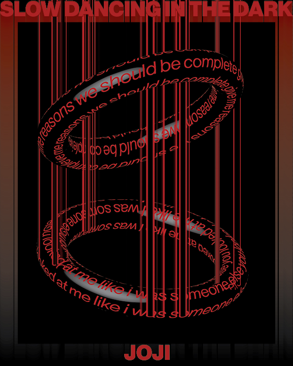 I designed this poster as a tour poster concept for the artist Joji. It features his song "Slow Dancing in the Dark". For the poster I chose to use rings with lyrics from the song in suspended animation. I was inspired to do this because when I listen to this song, it makes me feel like moving in graceful slow motion.